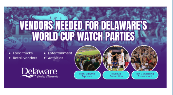 As Delaware gears up to celebrate the global excitement of the World Cup, we’re creating unforgettable watch party experiences across the state—and we want you to be part of it. From food trucks and local artisans to interactive experiences and merchandise vendors, we’re looking for businesses that can bring energy, flavor, and creativity to these events.